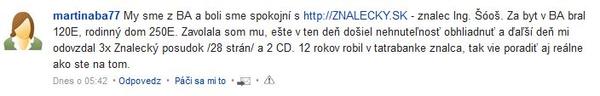 Aha, asi sa chcel clovek iba pochvalit, preto rovnaky text do kazdej temy. Su z BA a boli spokojny s panom Ing. Šóošom. Musel to byt velmi emotivny zazitok, ked to cloveku ani spat nedalo a bolo treba do kazdej temy, co sa okolo znaleckeho posudku co i len pohla, to hned napisat. Hned rano, mozno este v noci, rychlo sa registrovat, a pisat a.., prepacte, kopirovat a kopirovat, hned 41 prispevkov uz rano. Super do vecera sa toho este da stihnut. Super. Super ak by neslo o reklamu a z mojho pohladu o velmi ubohu reklamu.