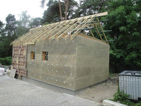 čo sa týka debnenia, tak možno postačí aj takéto, ako je na foto z pokusnej stavby v Poľsku. Konopný betón je 7x ľahší ako obyčajný, preto nároky na odolnosť debnenia sú menšie.