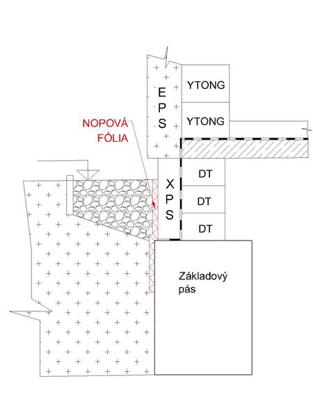 Nopovu foliu treba pri zakladoch zahnut do L od domu a vyspadovat, aby pripadny privalovy dazd odtekal od domu. Nopovka k zakladovym pasom nepatri. Staci do hlbky Xps a zahnut od domu.