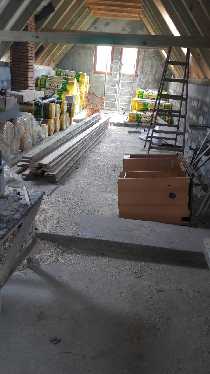 Podlahu v podkrový by som veľmy nerád zaťažoval ďaľším betonom, keď že je to starý domček prevažne z valkov a je prepojený samozrejme drevenými trámami