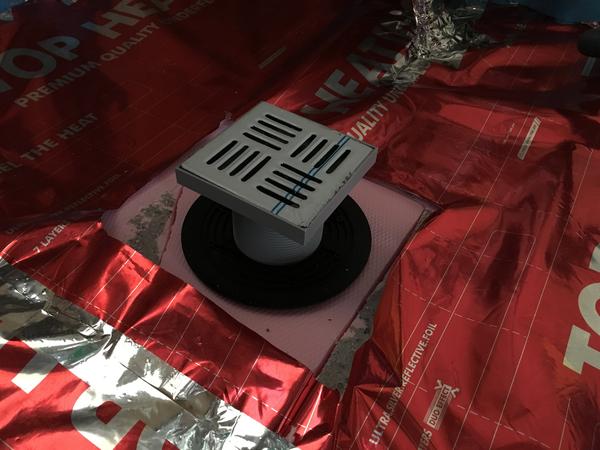 Ako by ste riešili podlahovú vpusť vo fáze vylievania anhydridového poteru? Je to model od AlcaPlastu. spodný čierny tanier je nasunutý na 50 mm kanalizáciu a je položený na polystyréne. Horný kus s mriežkou sa dá ľahko vybrať a skrátiť podľa hrúbky poteru. Tanier má väčší priemer ako horný kus.