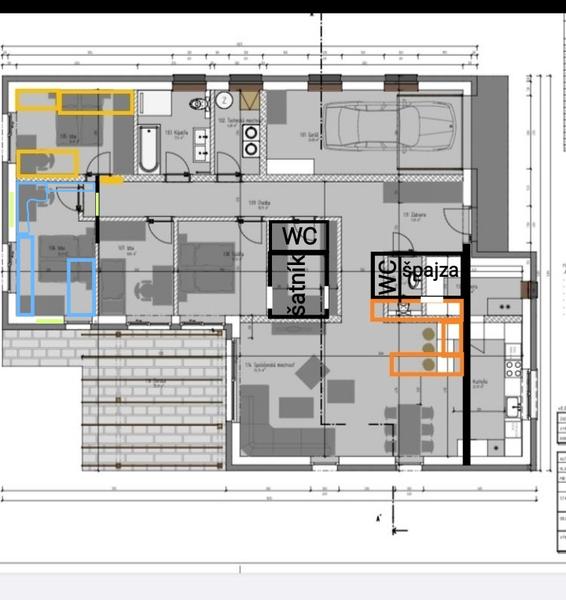@franci1986 ak chceš zmenšiť kuchyňu a aj chodbičku k dennej časti, dá sa to aj takto....wc samozrejme nechať len 1, podľa toho, či chceš viac miesta v špajzi alebo v šatníku. Bielym som naznačila, kde by mohli byť dvere do šatníka, a do špajze.