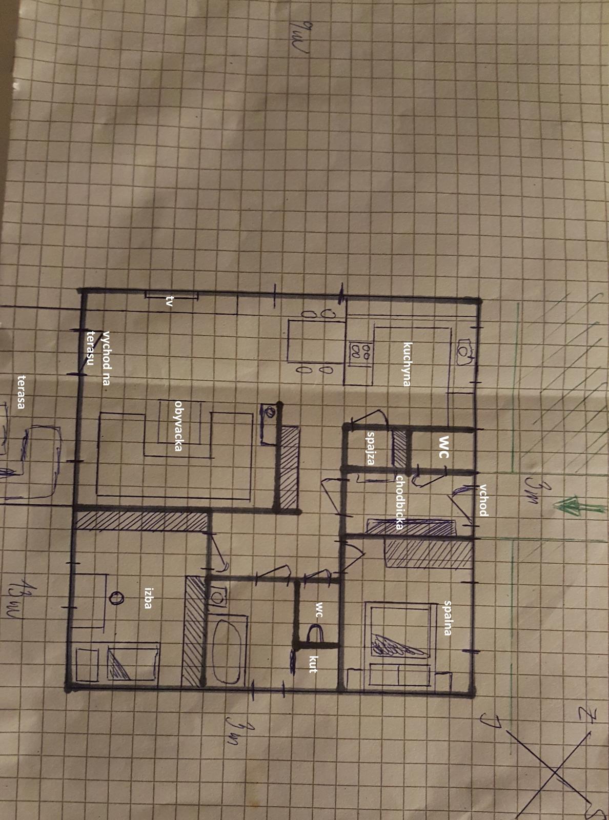 posielam prvy nastrel domceku 9x9, ktory sme nacrtli. Nebabrala som sa s tym v nijakom programe kedze toto bolo najrychlejsie.