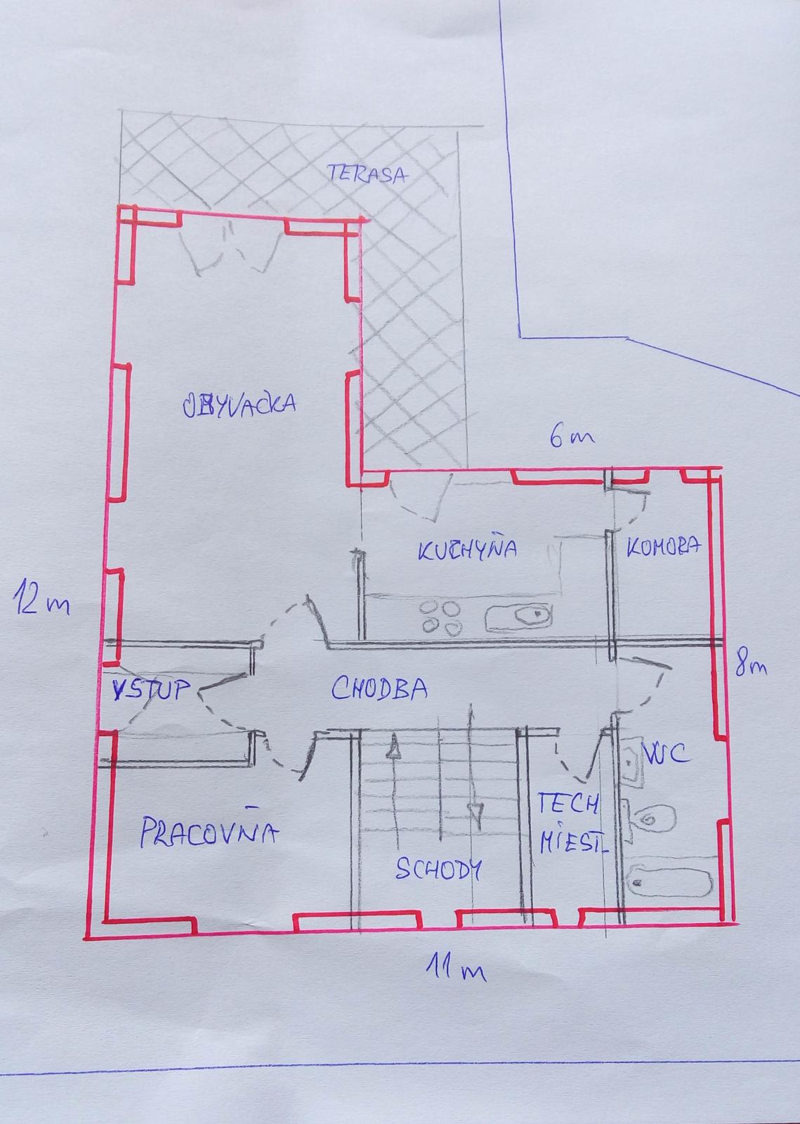 tak som v rychlosti nakrelil ako to mozes urobit - je to iba rýchly nákres takze okna dvere a velkosti az tak neries to si uz mozes upravit sam - ale mas vyriesený problem ze nebudes chodit s riadom cez obyvacku a tak isto návsteva sediaca v obyvacke ma vyhlad do záhrady a nie na ulicu.