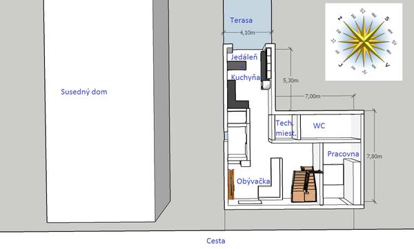 Náš neštandardný pozemok nám nedovolí stavať katalógový dom a musíme ísť do projektu na mieru. Avšak bojujem s sám so sebou a pozemkom, ako dobre spraviť vnútornú dispozíciu, vzhľadom na pozemok, orientáciu na svetové strany a blízkosť verejnej cesty.
