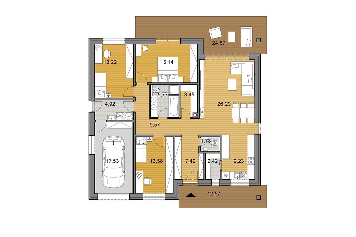 @anpevi ak je vchod zo severu, potom by som vymenil spálňu s detskou izbou pri vchode, zrušil by som garáž a namiesto nej by som urobil rodičovskú kúpeľňu a o zvyšnú časť by som zväčšil spálňu pri vchode. Tiež by som vymenil technickú miestnosť s kúpeľňou, nech má kúpeľňa okno. Prestrešenú terasu by som nezväčšoval, ale postavil by som v záhrade altánok