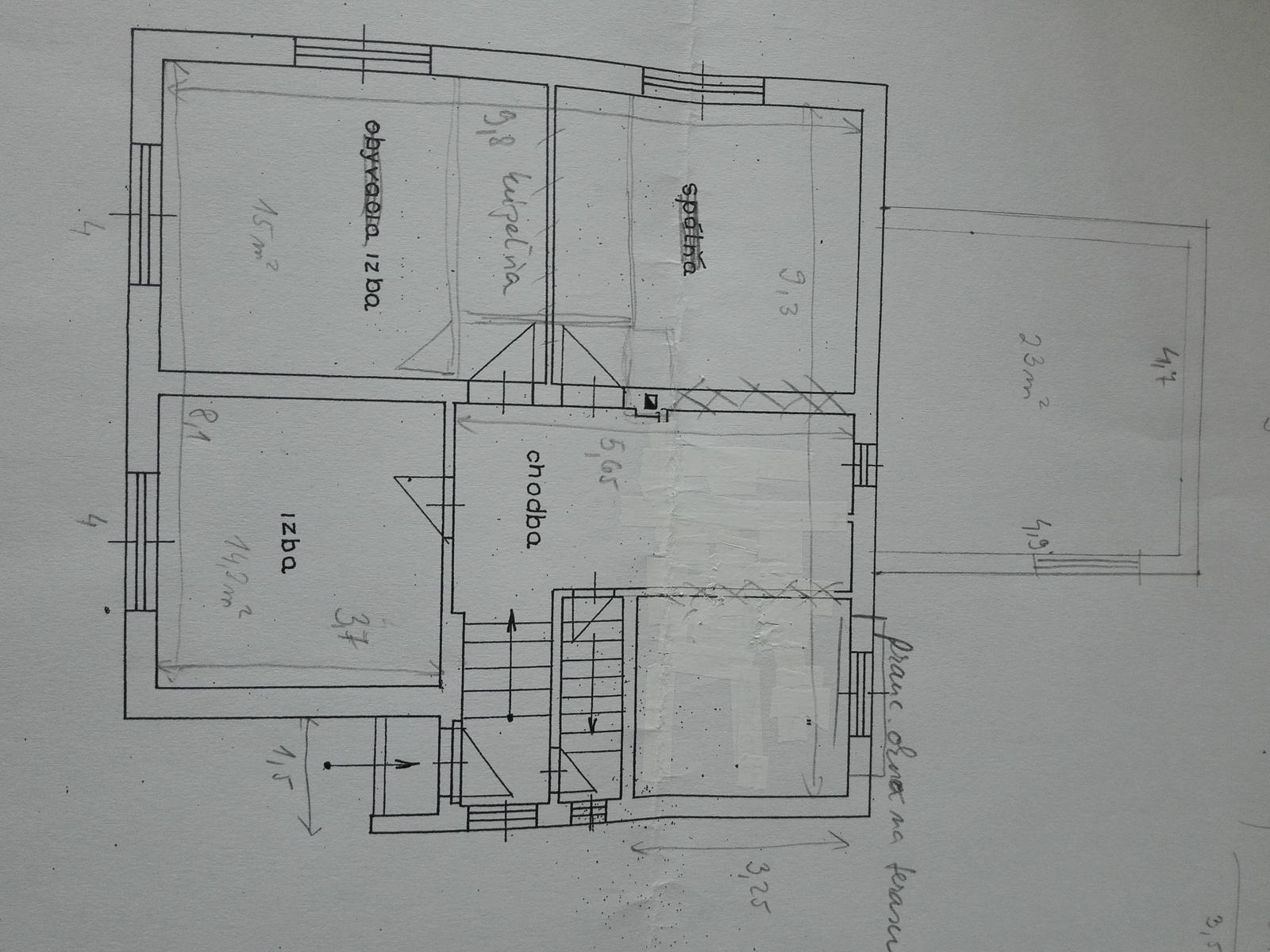 Ahojte strecháči. Trápim sa s dispozíciou v staršom dome. Pri terasa by som chcela mat obývačku. A dve predne izby zachovat ako detské. Zvyšný priestor vyplniť obývačkou, kuchyňou, spajzou a spalnou. Poraďte.Ďakujem