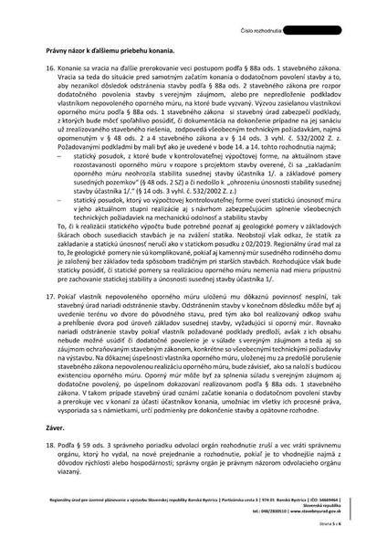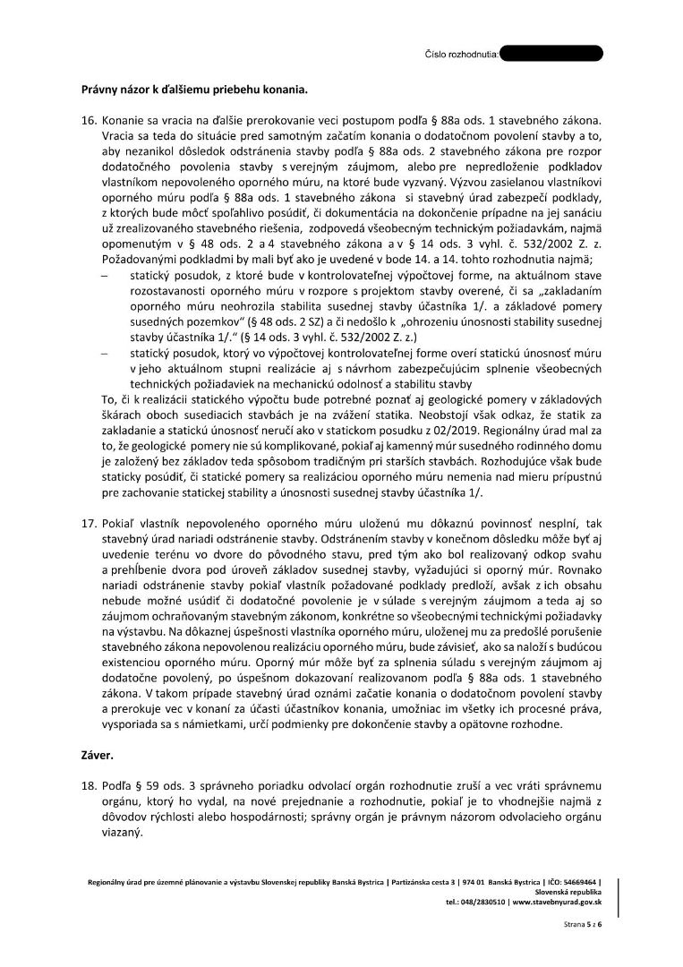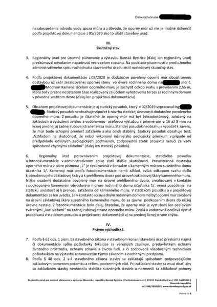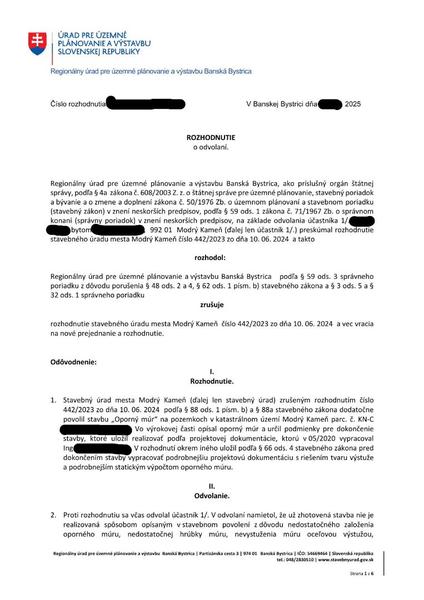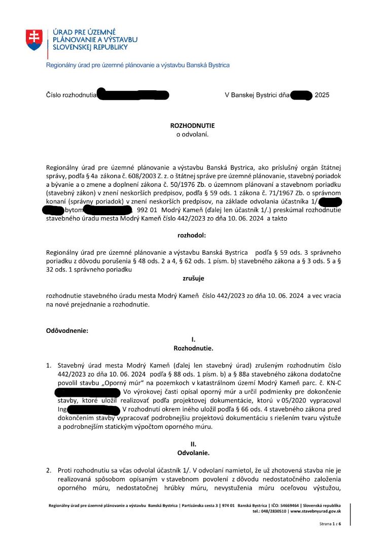Stavebný úrad musí urobiť to, čo mu povie nadriad… @moratibru V rozhodnutí regionálneho úradu z 02/2025 je zrušenie dodatočného stavebného povolenia a nariadil vykonať doplnenie dvomi statickými posudkami (na oporný múr a na náš dom) s kontrolovateľnými výpočtami. Keďže v uvedenom rozhodnutí nie je uvedená lehota, stavebný úrad mal vyzvať stavebníka v primeranej lehote na doplnenie dokumentov. Pokiaľ nedodá požadované dokumenty má byť stavba odstránená. Zákonom 211 v apríli 2025 sme žiadali primátorku, v akej lehote musí tieto dokumenty doručiť. K dnešnému dňu sme bez odpovede.Odpoveď na príspevok od stasa68: