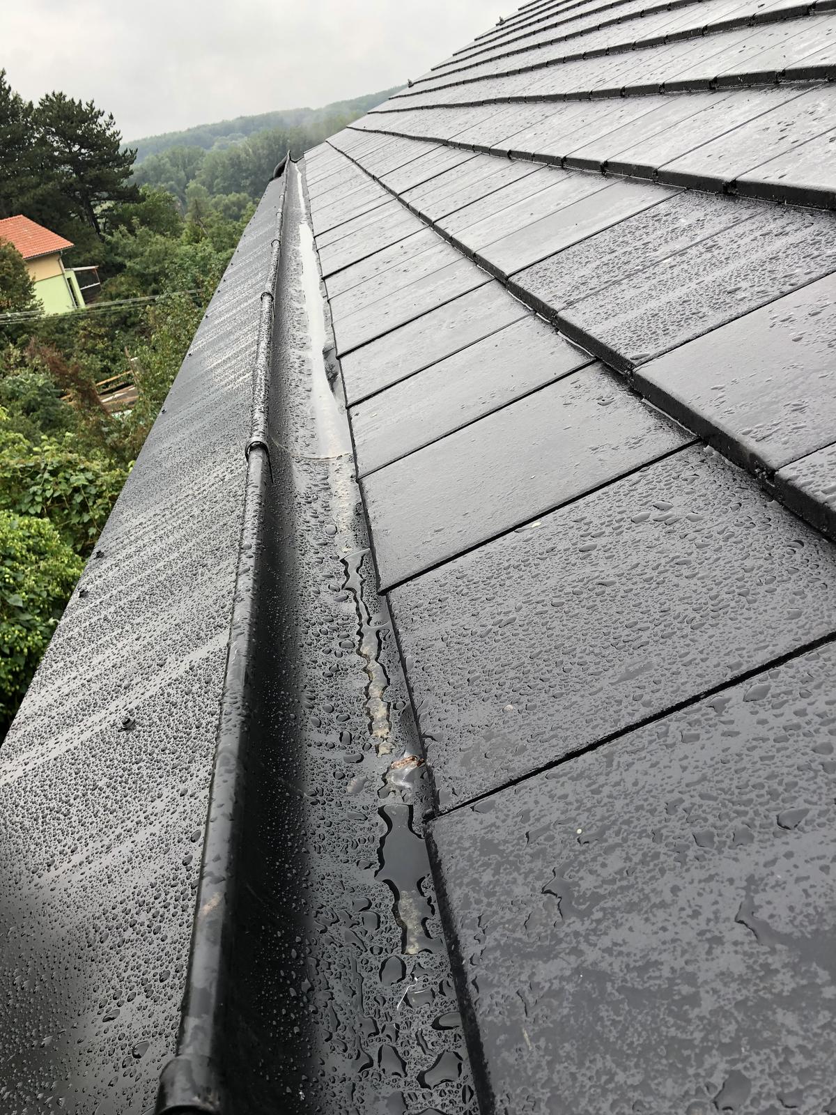 som zvedavý na opdpovede, pretože ako remeselník neviem, či to bude účinný žľab, koniec žľabu je už teraz zatopený, . Nevidím šírku, ale ak je len po prvú latu, môže v zime zatekať. Tam sa malo odstrániť debnenie, zapíliť do krokvy a žľab zohnúť do vzniknutej priehlbne. Bolo by treba vidieť viac teraz už zakytých detailov. Ale obávam sa, že oprava bude možná len demontážou, úpravou podkladu a znovu montážou.