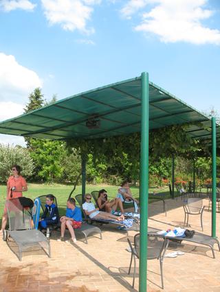 alebo aj prekrytie okolo bazena... presne nieco take by som brala na terasu, nebolo pod tym vobec teplo, ani v najvacsiej horucave a na zimu to moze ist dole... akurat kostrukciu by som urobila drevenu a nie zzeleznu....