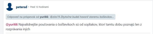 @yuri66 Najvalidnejšie poučovania o boľševikoch s… @petersd ja nie so soplanda, ja som si tych komancov odzila,a aj od nich dost zazila budem len rada, ked konecne pojdu na smetisko dejin aj ich pohrobkovia, ktori nam teraz vladnu. Na cele s nasim laskavy, starostlivym, dobropajnym sudruhom, uz stvrty krat panom premierom. Ozaj, ked uz sme pri tom porovnavani statneho dlhu, kolko rokov od revolucie vladol Smer? Ako je mozne, ze aj za vedenia tych najlespich, teda komunistickych pohrobkov, ktori o sebe prehlasuju, ze su socialni ten statny dlh len rastol a rastol? Aj v casoch najlepsej ekonomickej situacie vo svete a u nas stale dlho narastal. Neviem ako tebe, ale mne ta argumentacia nejak nesedi. Na druhej strane viem, tebe bolo dobre v zlatej klietke, nemusel si o nicom rozmyslat, povedali ti co si mas mysliet, aj zrat ti dali, aj ti povedali co budes zrat, aj robit ti dali, aj ti prikazali co budes robit, stacilo, ze otcoveho kona brat emigroval po druhom oslobodeni Rusmi a uz si bol odsudeny robit sustruznika aj ked z teba mohol byt spickvy lekar. Za doktorov sli studovat hlavne ti, ktori mali spravny kadrovy profil... Neopijaj nas tu suchym rozkom, nevyhrazaj sa mladsim rohladenejsim ako ty. Staroba nie je zasluha, prinasa spomienkovy optimizmus a odtrha od reality.Odpoveď na príspevok od zita19: