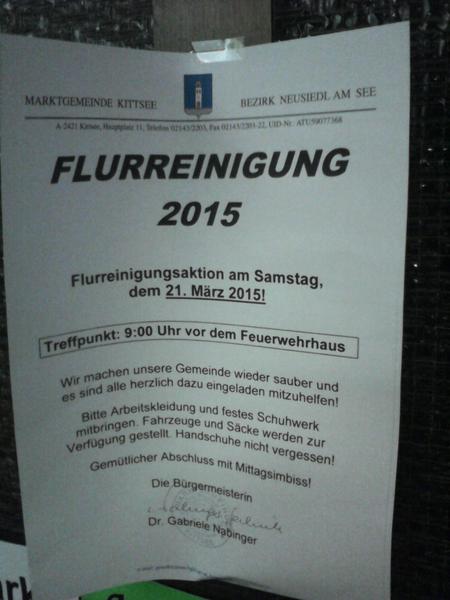 Dna 21.3. organizuje Starostka opat brigadu ohladne cistenia Kittsee od odpadkov. Kazdy komu zalezi na tom aby sme tu byvali v cistom prostredi je srdecne vitany.