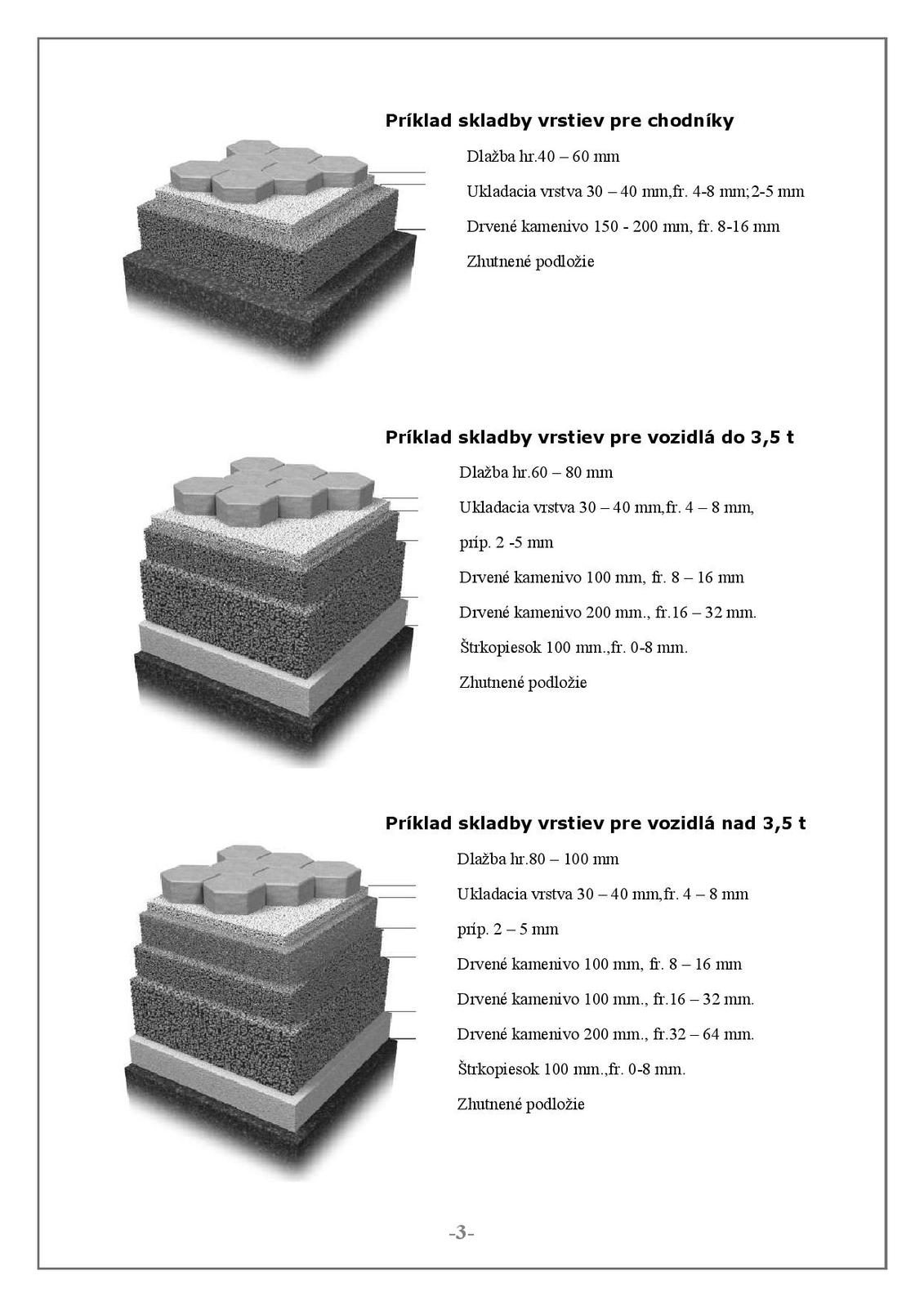 Základom každej spevnenej plochy je rovina, má byť naklonená, aby voda pritodzene odtekala. podľa toho, či podkald tvoria zmáčivé zeminy sa používa geotextília alebo mreža. Základná vrstva sa robí z hrubého kameňa, zhutniť sa dá len vrstva podľa hmotnosti prostriedku, takže 15 a viac cm. Podľa zaťaženia sa volia frakcie a počet vrstiev, pri parkovisku stačia dve, spodná 16/32-32/63 vrchná 8/16 doplnená 0/4. Práve tieto vrstvy sa zaklinujú medzi väčšiu frakciu a vytvoria pevnosť, to správne popisuje jakino. Podľa zaťaženia a unosnosti podložia sa volia hrúbky vrstiev, rozkladajú tlak kolesa (hmotnosť) na väčšiu plochu.