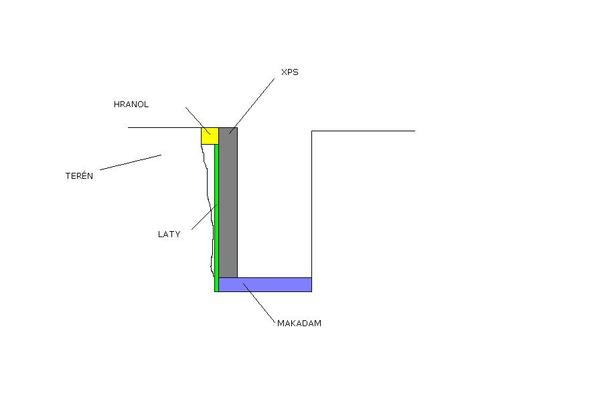 Bágrista nám zle vykopal pás, tam kde by mal byť terén je asi 15 cm medzera, keďže to krivo vykopal. Ide to zošikma, na jedenom konci je terén, tam je XPS opreté, ale na druhom konci je terén až 15 cm za XPS. Mám to už takmer nalepené, chýba len jedna strana.