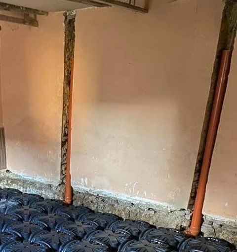 Podlaha v izbe "vybavena" systemom Iglu (nedavno sme to rozoberali - povodne hospodarska budova - momentalne je na iglu uz vsetko co ma byt vratane podlahoveho kurenia), na juznej i severnej stene vyvedene rury kvoli odvetraniu. V plane je predsadena stena zo sadrokartonu na severe vid foto.