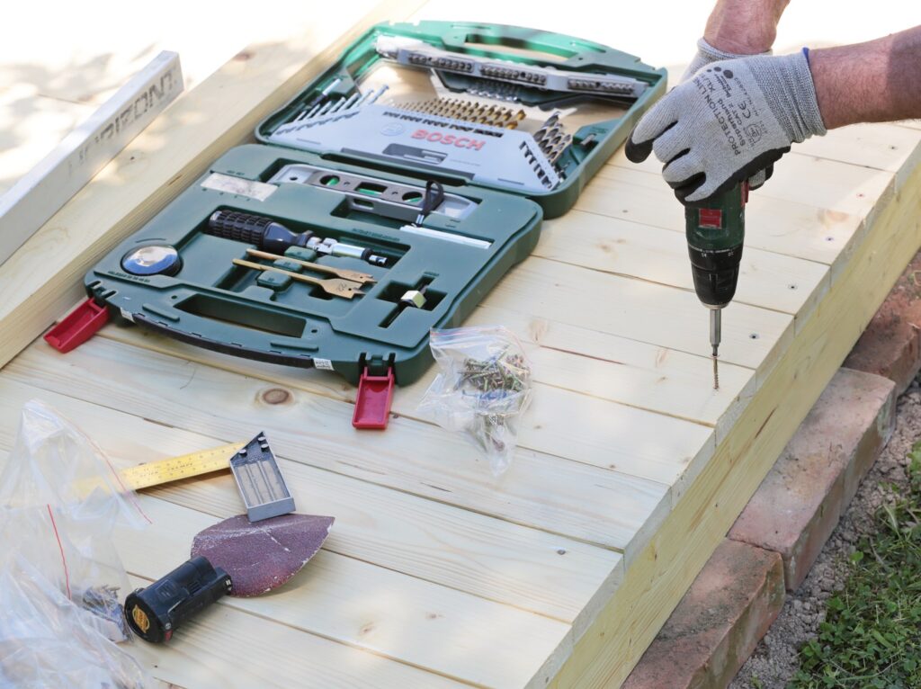 Hranoly základne zoskrutkujeme dlhými (v našom prípade 12 cm) skrutkami. Do hranolov sme pre istotu predvŕtali diery. Jeden hranol priskrutkujeme aj do stredu, po dĺžke základne, aby sa laty tvoriace podlahu v strede neprehýbali.