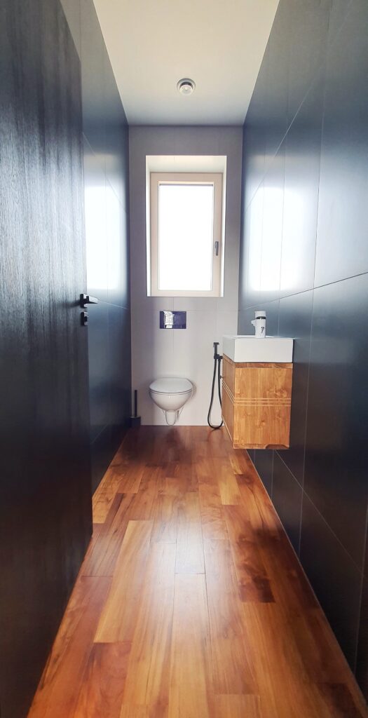 Veľmi sa mi páči petrolejová farba a nikde inde v dome sa mi nehodila. Tak som ju navrhla do kúpeľne. Drevená podlaha bol nápad môjho partnera a bolo to naozaj skvelé rozhodnutie. Bolo trošku ťažšie nájsť vhodnú skrinku, ale nakoniec sa mi to podarilo a našla som ju presne vo farbe obkladu.