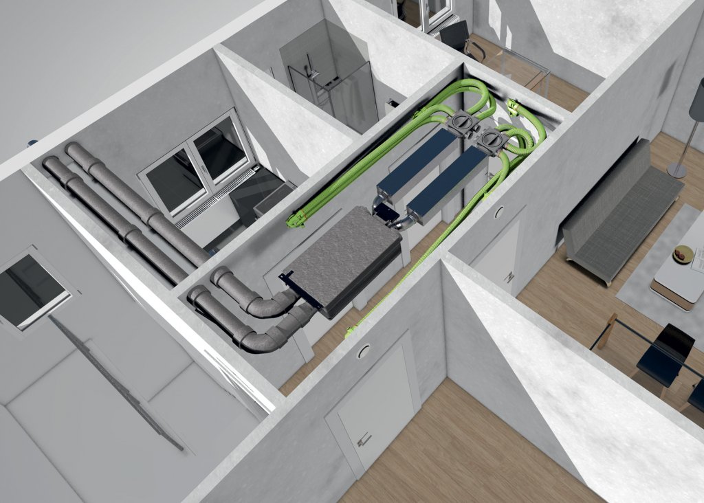 Od jednotky je tiež nutné viesť rozvody, najčastejšie potrubie umiestnené pod stropom, pričom pri dodatočnej montáži sa často využíva ploché potrubie s minimálnou výškou, ktoré sa môže zaviesť do každej miestnosti. Hoci je inštalácia relatívne jednoduchá, odporúča sa konzultovať návrh s odborníkmi, ktorí pomôžu správne vypočítať výkon vetracej jednotky a rozvrhnutie rozvodov.