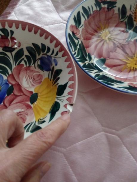 Retro maľované hlinené taniere cena za kus 7e. Veľký hnedý a ružový majú ťukanec