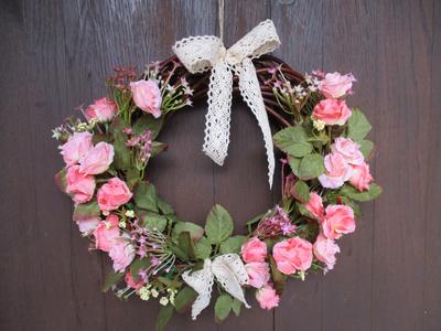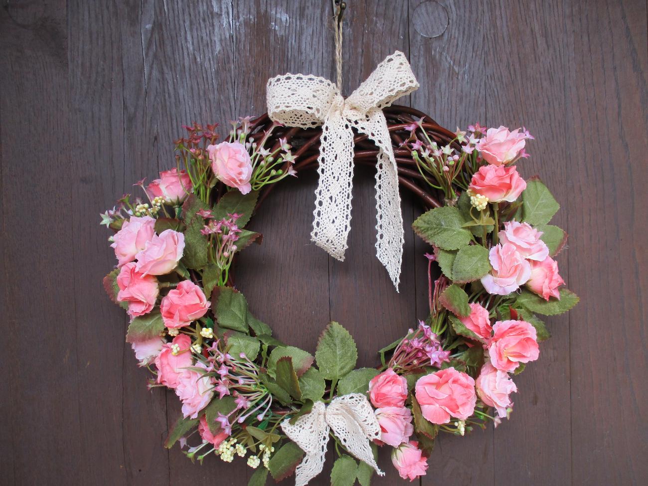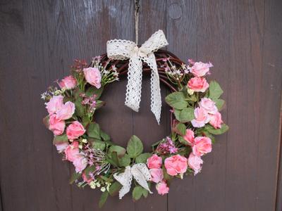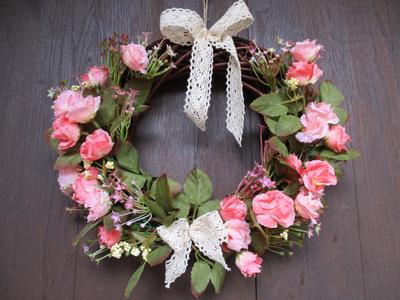 Veniec s textilnými ružičkami v odtieňoch ružovej a umelou zeleňou na prírodnom prútenom základe, dekorovaný čipkou v krémovej farbe. priemer cca 32 cm; cena 15€ + poštovné