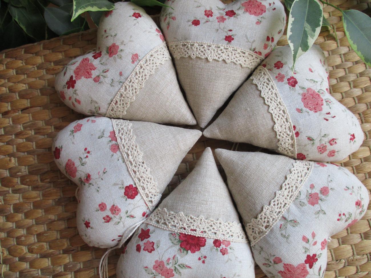 Srdiečka ušité z bavlnených látok v kombinácii vzorovanej s kvietočkami v staroružovej farbe na režnom podklade a jednofarebnej režnej. Dekorované čipkou v béžovej farbe a prírodným motúzikom na zavesenie. Srdiečka sú vyplnené z časti sušenou levanduľou a z časti dutým vláknom. veľkosť: 10x10cm; cena za jedno je 1,10€ + poštovné