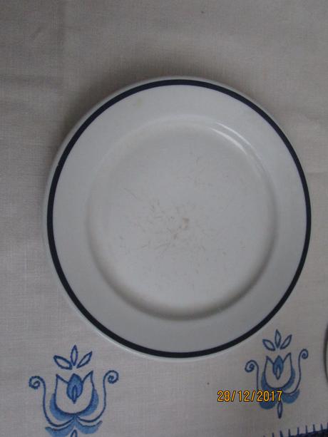 Tanierik s modrým okrajom . Priemer 19,5 cm, znač. kus. Nepoškodený. Je to starý tanier. Mám len to, čo je nafotene, možno niekto potrebuje doplnit sadu.