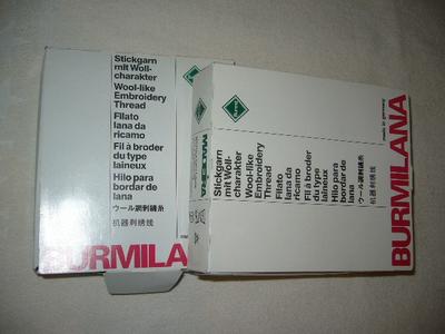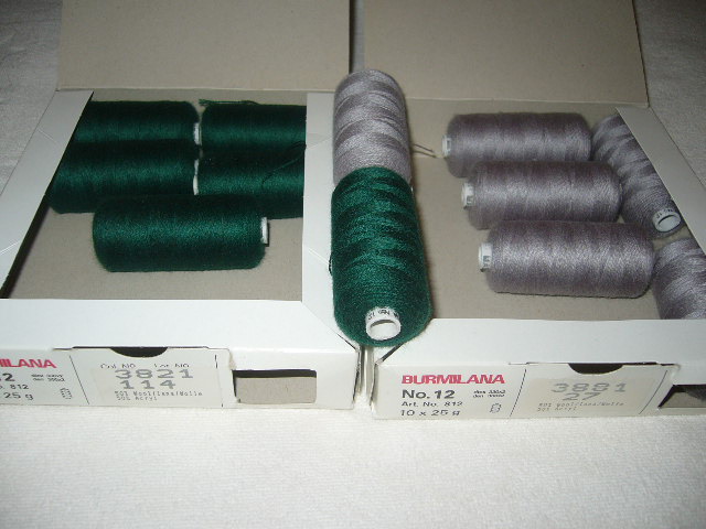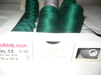 Hrubsie nite zn.Burmilana č.12. Jedna špulka ma 25g.Podla mna su vhodne aj na rucne vysivanie. Na krabicke su este pridane poznamky :dtex 330x2 ::::::::den 300x2. Zlozenie: 50% vlna + 50% akryl.Farba je siva a pekna syta tmavo zelena. galant
