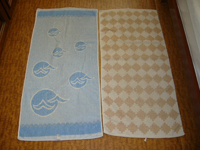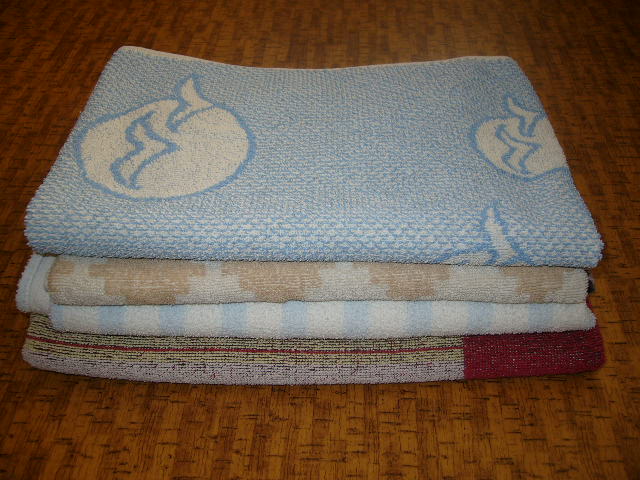 Pouzivane,ale uplne zachovale frote uteraky - cena za jeden kus 1.70 modry+hnedy uterak maju rovnake rozmery - 91x44 -modry predany biely uterak s modrymi pruhmi ma rozmer 66x105 -predany bordova osuska s loďou 138x75.Z jednej strany je viac bordova,z druhej strany modra.cena osušky 3.20. GA