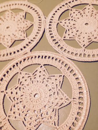 Staré, krásne, dekoratívne, háčkované dečky v kovovom ráme do okien. Sú béžovej farby. Priemer veľkej je 20 cm, 3 malé priemer jednej 15 cm. Posielamm na dobierku