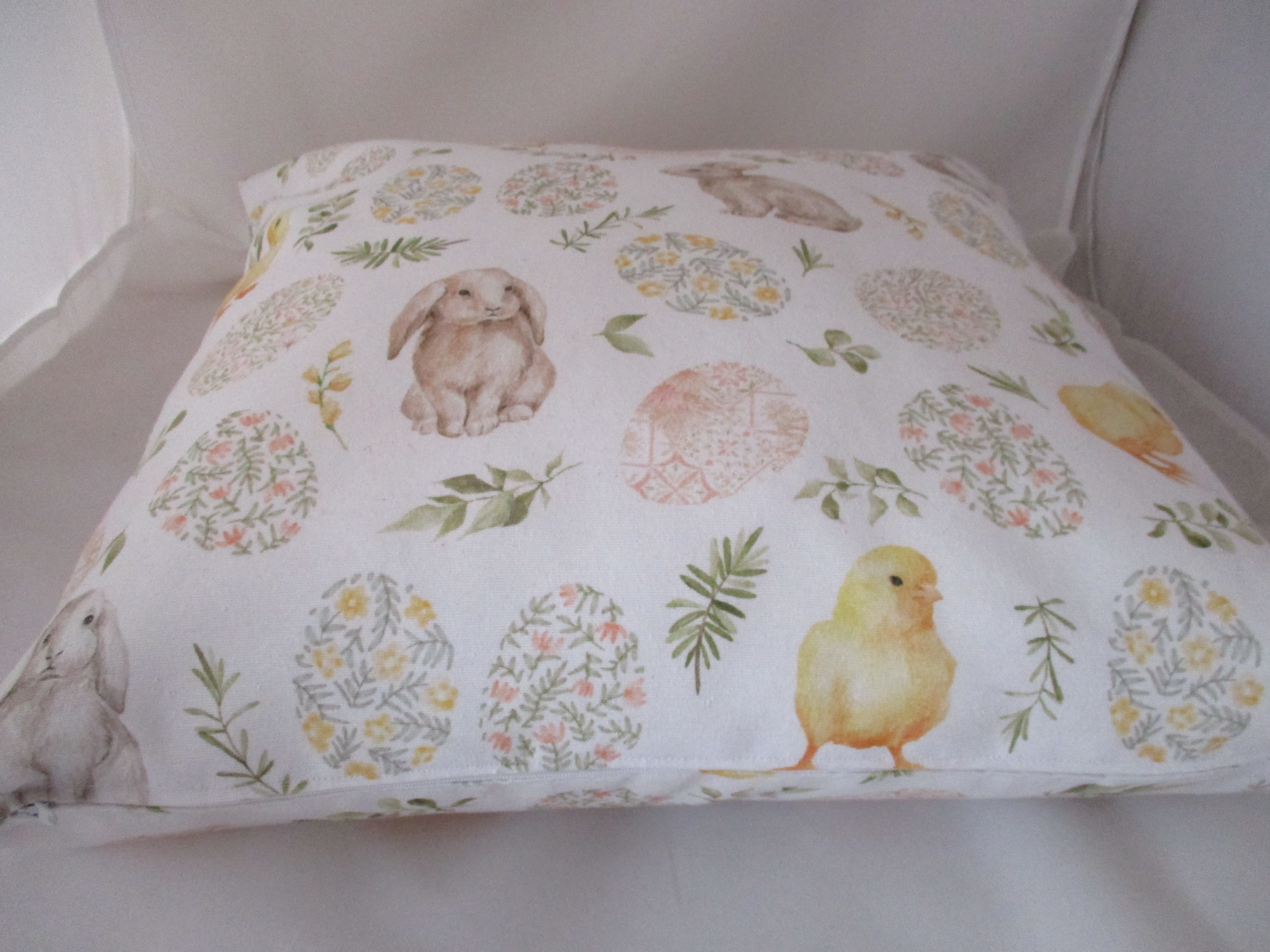 Obliečka ušitá z pevnej bavlnenej látky, s veľkonočným motívom v jemných pastelových farbách na bielom podklade. V spodnej časti je zapínanie na zips. Veľkosťou je vhodná pre vankúš s rozmerom 40x40 cm; (v ponuke mám s týmto vzorom aj s rozmerom 50x50cm); ks/6,-€ + poštovné;